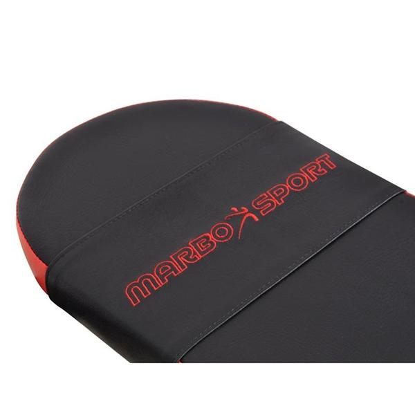 Praktickou stránkou lavice MARBO MH-L104 2.0 je možnost rychlého složení například pod postel. Skládání se provádí pomocí šroubů s plastovým, ergonomickým úchytem. Na zarážky se navlékají 8 centimetrů vysoké válce z EVA pěny. Polstrování jsme opatřily dvojitými švy pro maximální pevnost. V nejnamáhanějším místě jsme opěrku přetáhli druhou vrstvou kůže s logem MARBO Sport.
